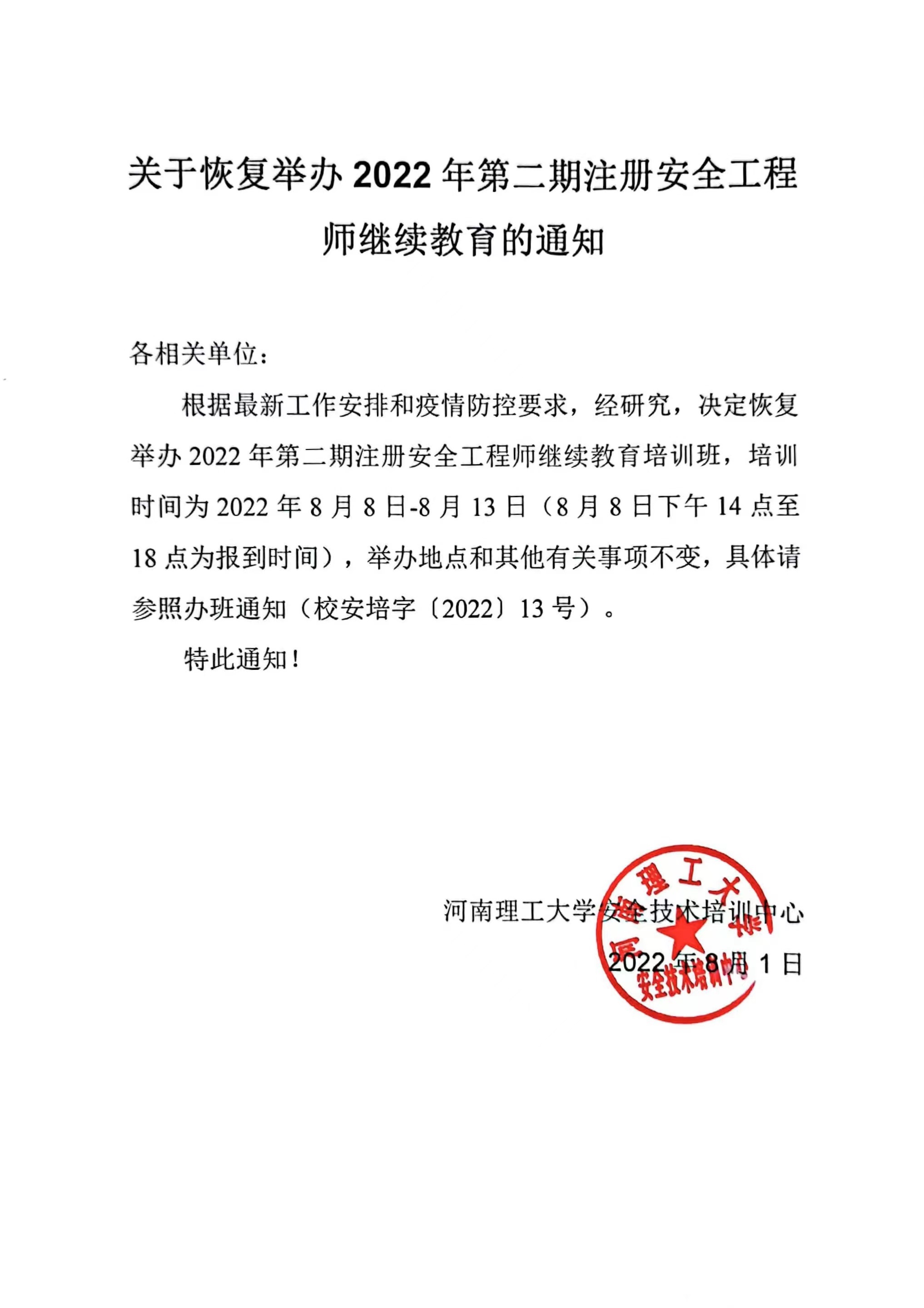 关于恢复举办2022年第二期注册安全工程师继续教育的通知
